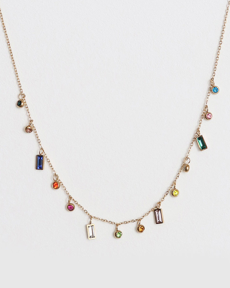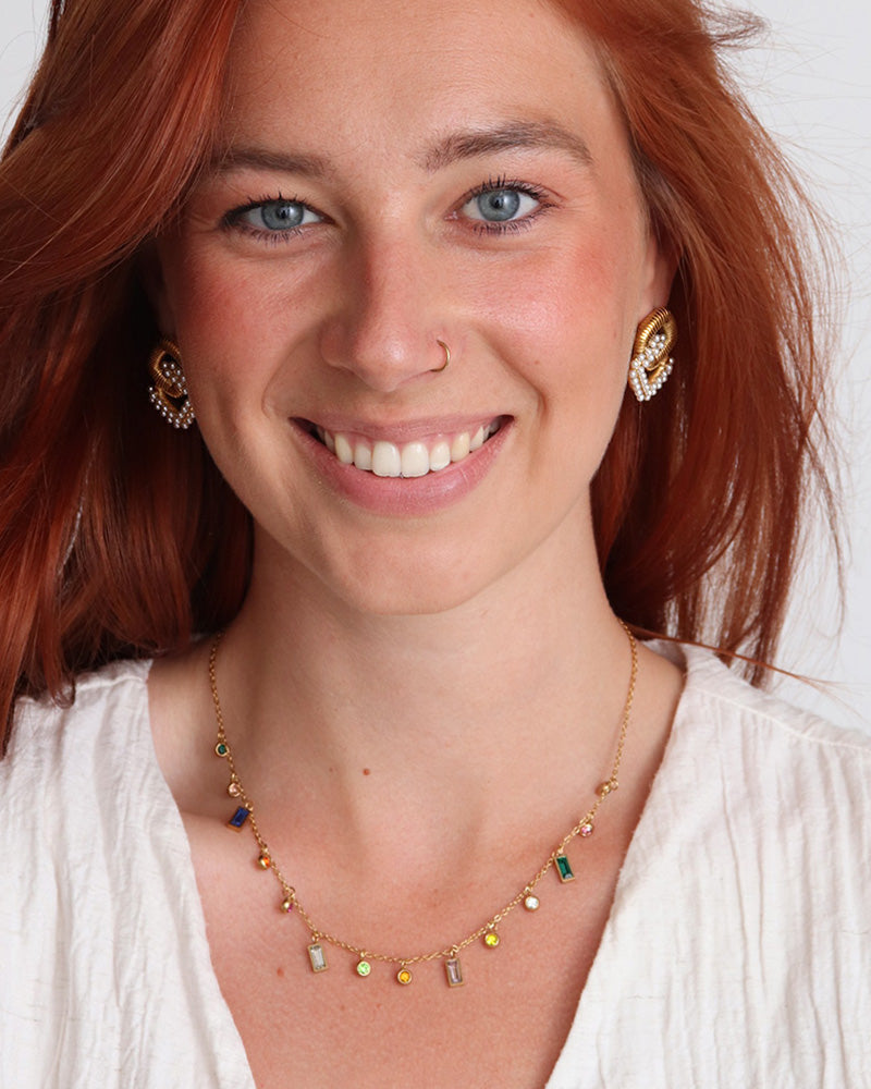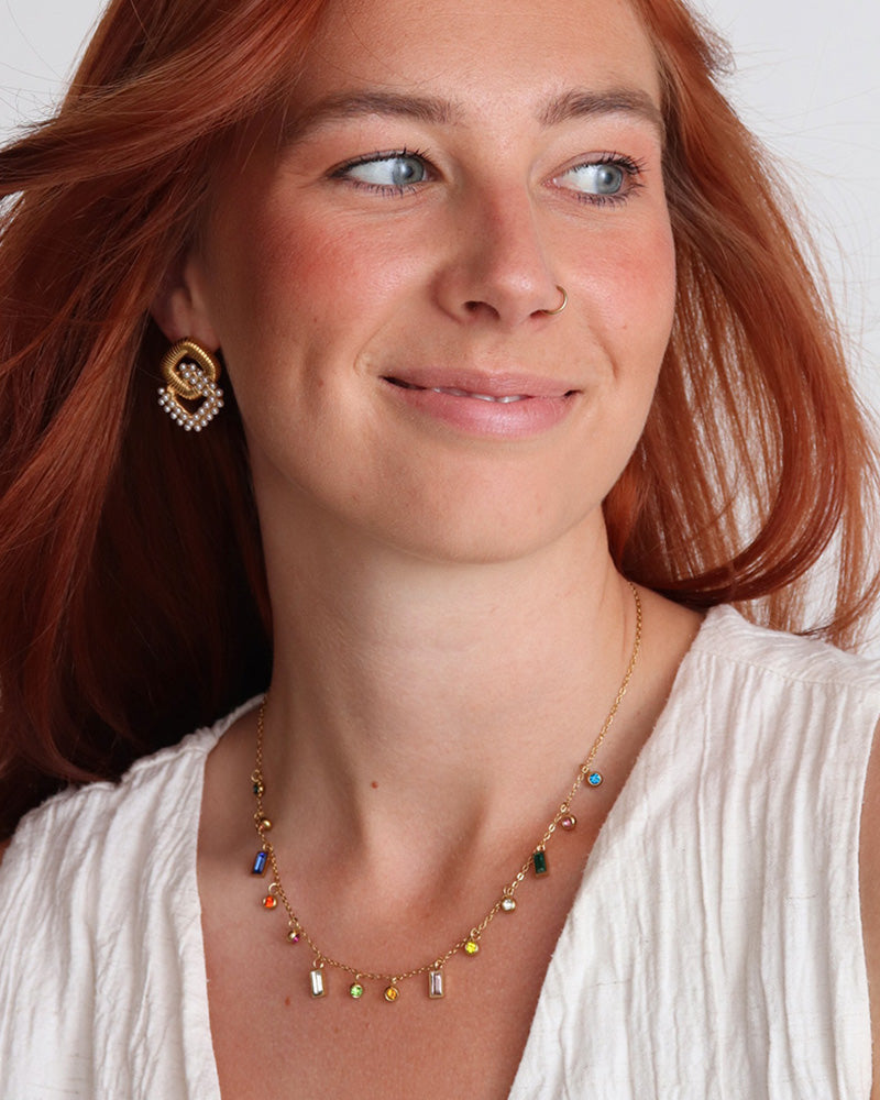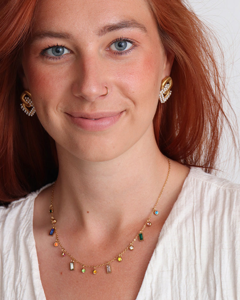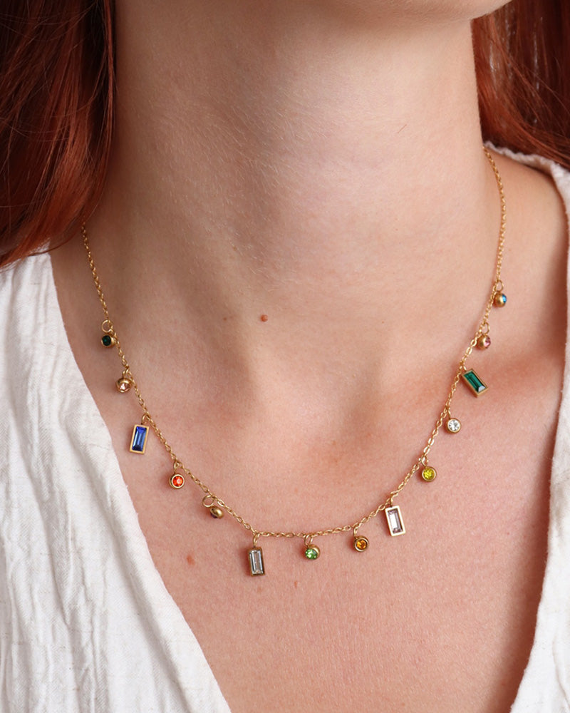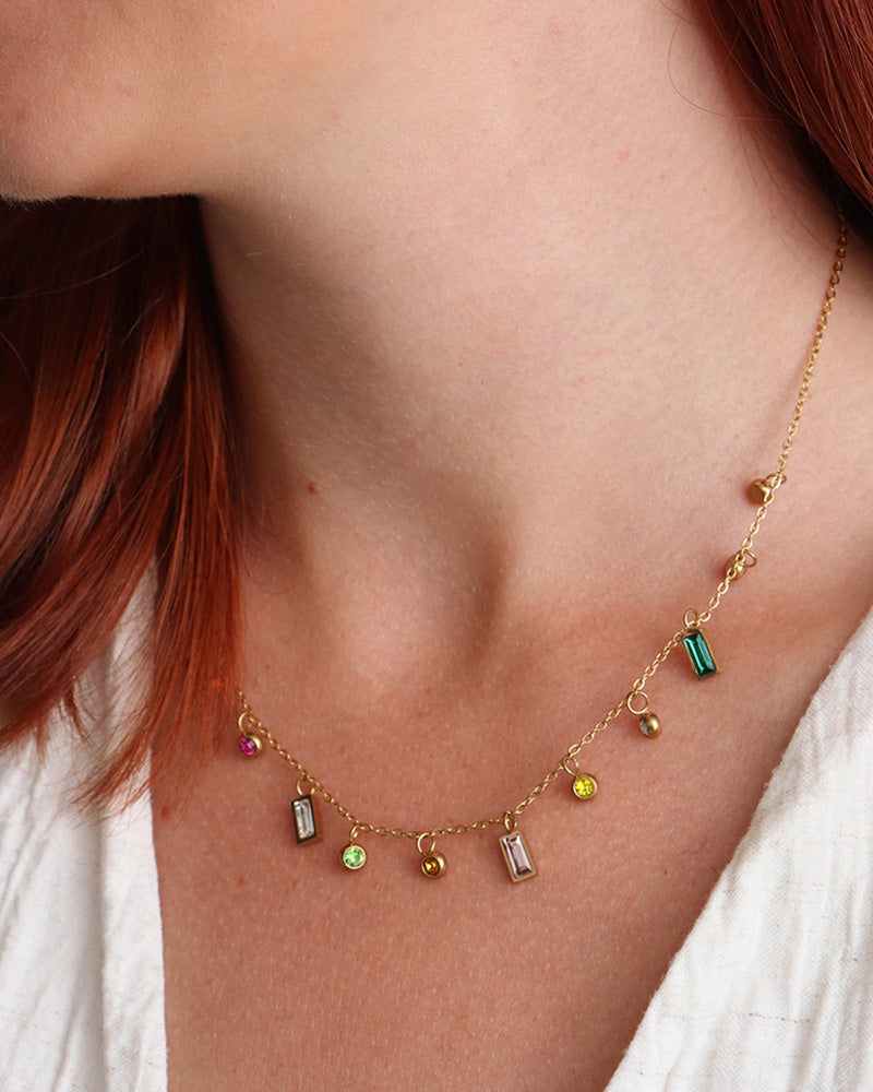 Add a touch of sparkle and personality to your jewellery collection with our Bejeweled Necklace. This enchanting piece features an array of dazzling charms, each adorned with vibrant gemstones that catch the light and captivate the eye.